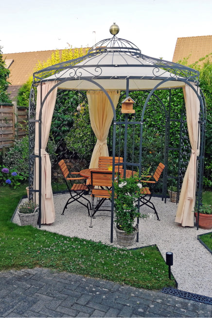Si vous recherchez une entrée de jardin exceptionnelle qui offre non seulement un attrait esthétique mais également des fonctions pratiques, une rosace avec porte est le choix parfait pour vous. Du treillis pour plantes grimpantes au brise-vue en passant par l'ambiance romantique, cette arche contribue à l'embellissement et à l'enrichissement de votre jardin. Découvrez notre arche de jardin Calabria avec portillon . Ce modèle en métal massif séduit par son look romantique, ses décorations élégantes et son portail assorti, ce qui en fait l'entrée de jardin parfaite.