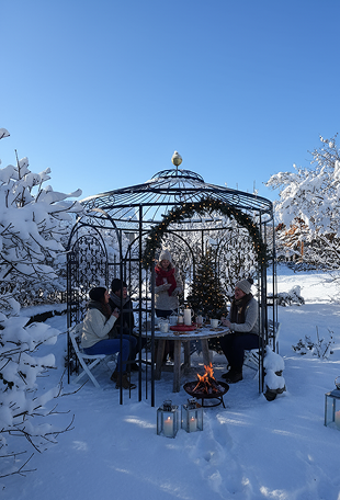 Les matériaux résistants aux intempéries comme le métal sont particulièrement adaptés à une utilisation en extérieur et notamment pour le jardin. Vous pouvez également créer une ambiance festive dans le jardin avec des branches, des guirlandes lumineuses et des boules.